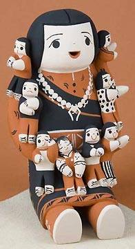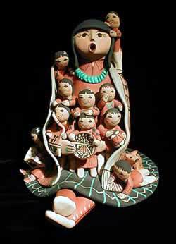 A Storyteller Doll is a clay figure made by the Pueblo people of New Mexico. The first contemporary storyteller doll was made by Helen Cordero of the Cochiti Pueblo in 1964 in honor of her grandfather who was a tribal storyteller. | A Storyteller is basically a figure with its mouth open, surrounded by figures of children & other things, representing those who are listening. The rich cultural & religious heritage of previous generations helps to develop an understanding of how the past has influenced the present & reinforces the importance of understanding one's own family history.