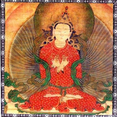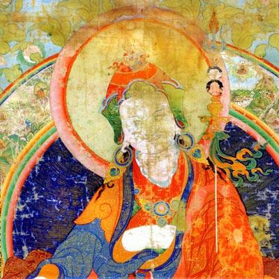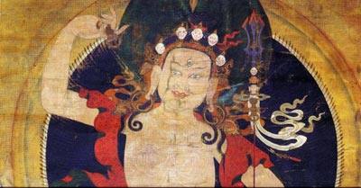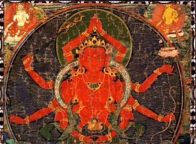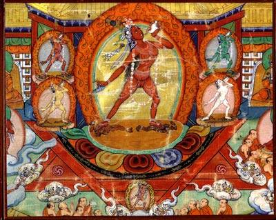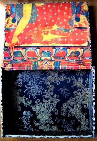 | Dharma Box (Inside) Inside box lid is covered with a continuation of the thangka, as are the outside sides of the box. Inside bottom of box is covered with brocade. | Chitipata, Masters of the Charnal Ground 7" x 8" x 3" $50 (+$5 S&H) |